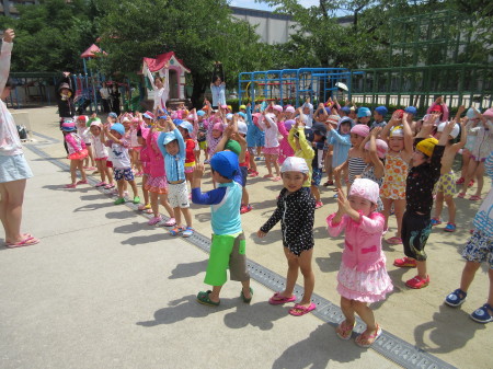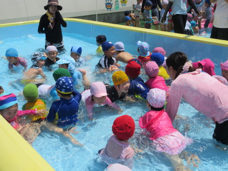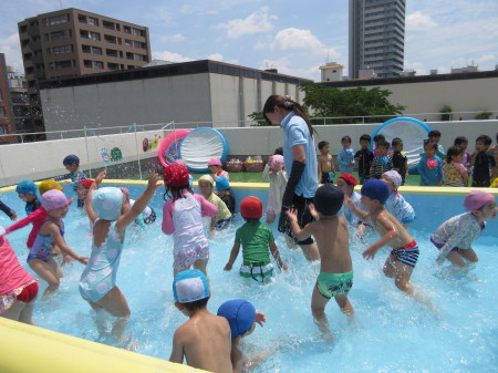 お天気に恵まれた中、年少組は屋上の大きなプールに入りました♪