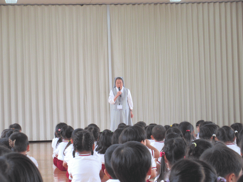 「いつも神様が見守って下さっていることを忘れずに、一日に一回でもいいからマリア様のお祈りをお捧げしてみてね。」とお話をいただき、そのお話を真剣なまなざしで聞く姿が見られました。
