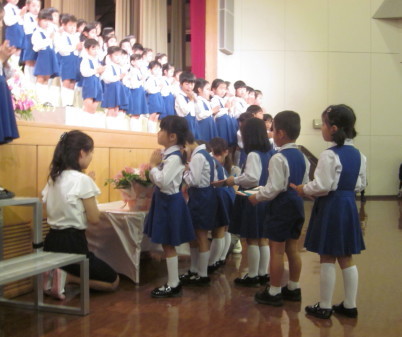 その後、今日を迎える準備として行なってきた「徳の花」を、各学年の代表の子ども達が捧げます。