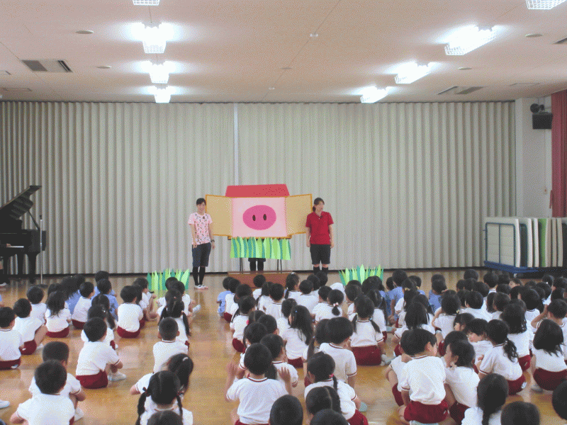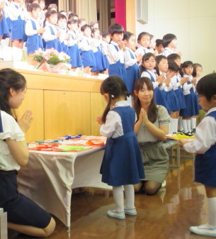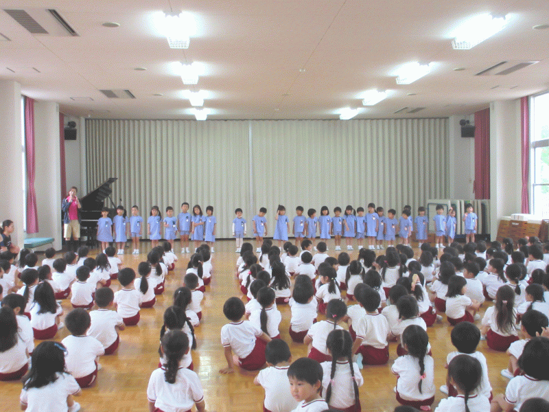 講堂では年長組の子どもたちが前に並び、