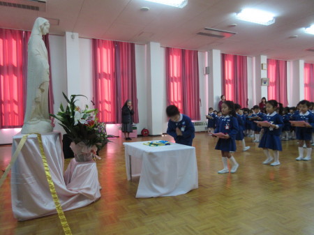無原罪のマリア様のお祝いをし、部屋に帰る前に、マリア様に手を合わせた子どもたち。