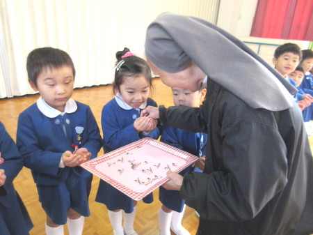 きれいに飾られたマリア様が、遊戯室で子どもたちを迎え、そして、見守る中お祝い会が始まりました。