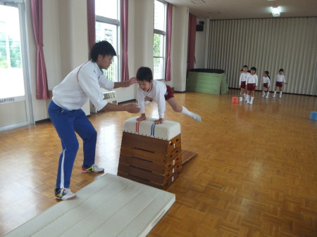 体育指導では、子ども達が自由遊びのときも頑張っている跳び箱をしました!