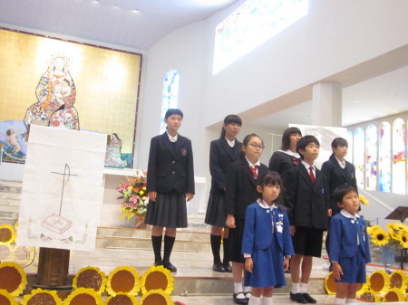 式の最後に、これからもドン・ボスコノの思いを受けつぎ、やさいい心、愛の心を大切にしていこうと「ひまわりの種」を神父様からいただきました。