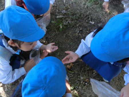 「こんなにたくさんあったよ〜」「どんぐりの帽子があった!」