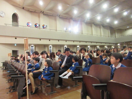 講堂に新入園児の子どもたち、そして、在園児代表として参加した年長組の子どもたち。舞台には来賓のお客様、先生たち。みんなが集まって、入園式が始まりました。