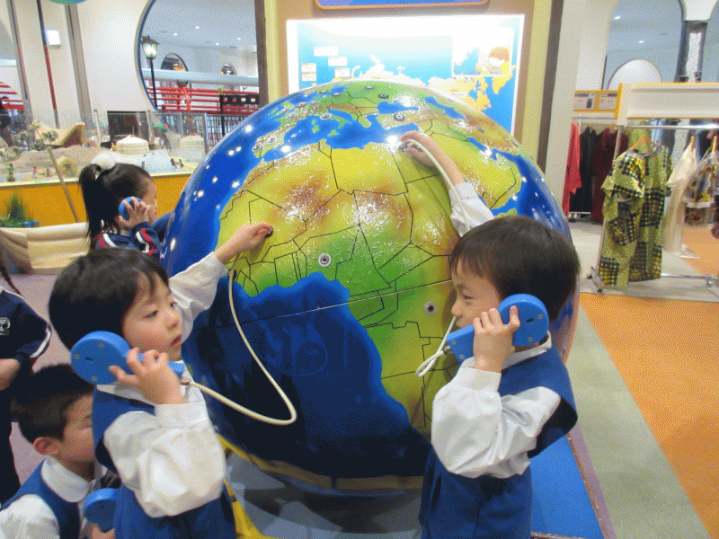 “せかいのこんにちは”では、大きな地球儀のいろんな所に穴があいていて、その穴に
