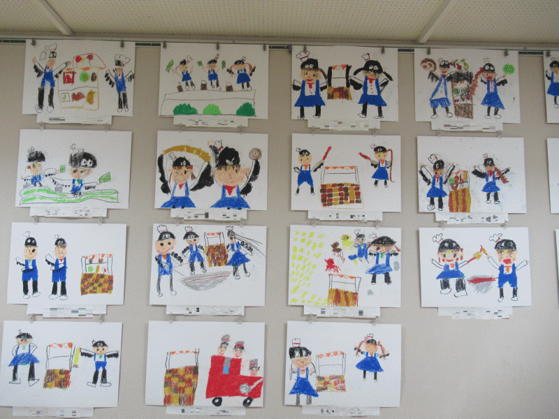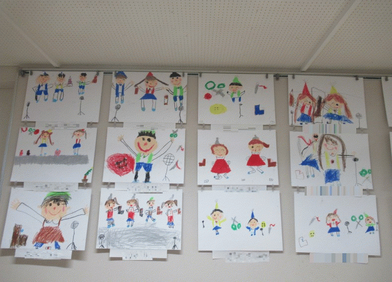 年中組の3月壁面は、クレパス画「発表会の絵」です♪