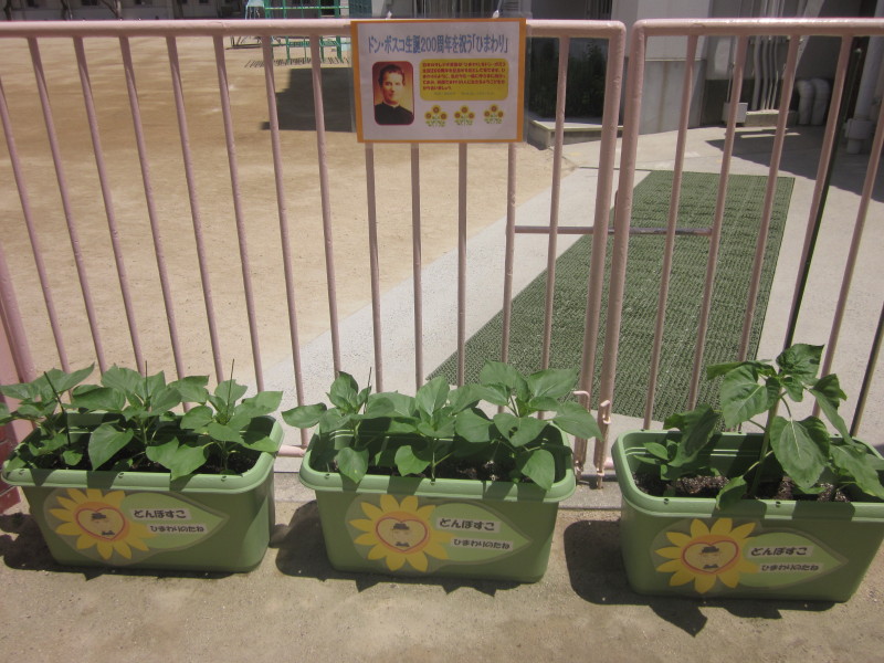 6月の半ばに植えたドン・ボスコのひまわりが、太陽のひかりとたくさんのおめぐみをいただいて、スクスクと伸びてきました!