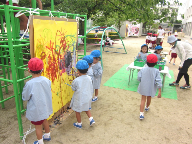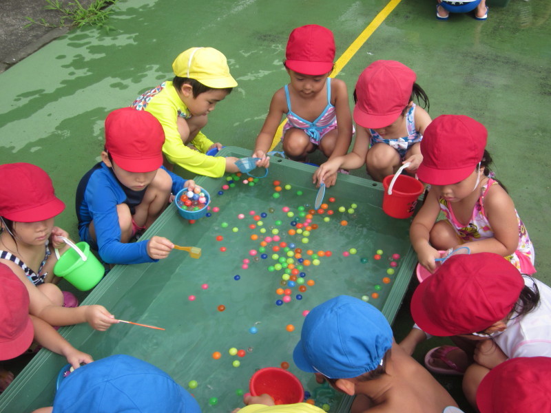 ぐるぐる洗濯機や宝探しをしたり、自由あそびでは、先生対子どもたちで水掛けをしたり…とても充実した時間を過ごすことが出来ました!