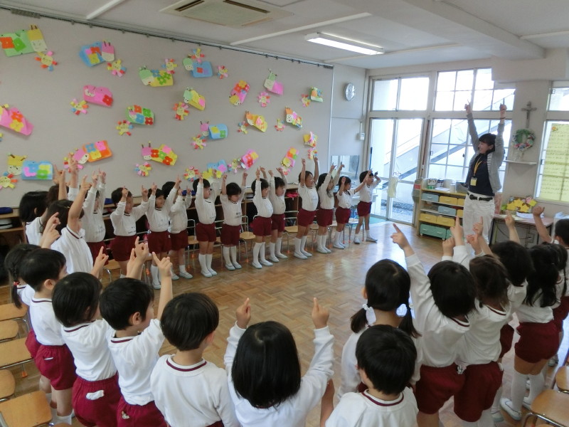 ごあいさつが終わったら、英語の曲に合わせて手遊びをしたり、体を動かしたりして遊びました☆