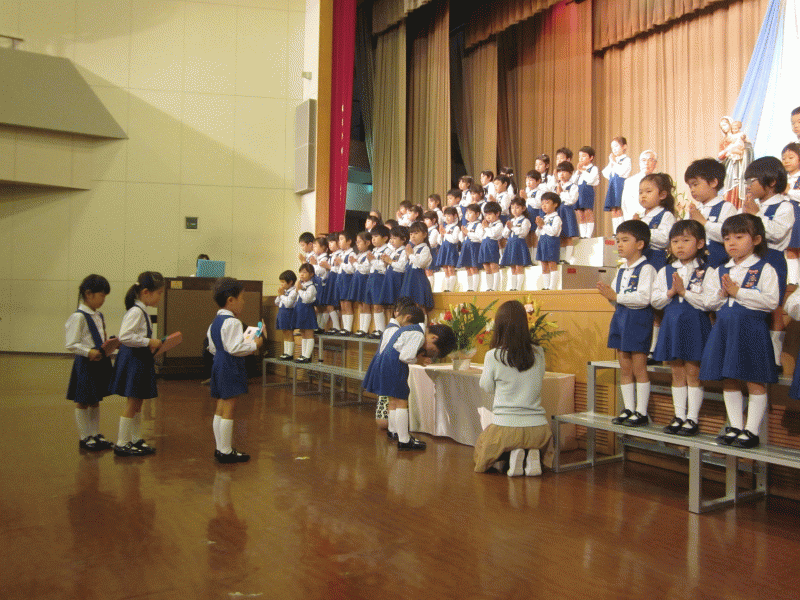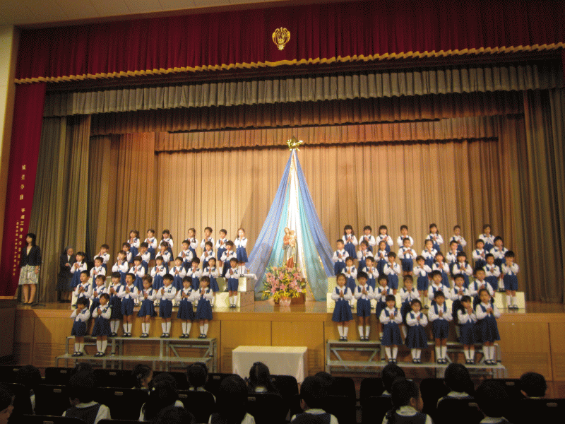 年長組の歌に合わせて、「神様がわかるでしょう」「マリア様のこころ」などの聖歌を歌う子どもたちの声が、講堂に響いていました。