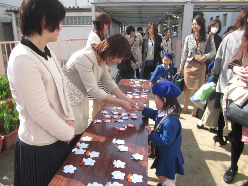 幼稚園に着くと、ピカピカの名札の所に一直線の子ども達!