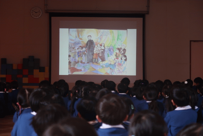 そして、絵本「ちいさなヨハネのおおきなゆめ」をスクリーンに映して、みんなで見ました。ドン・ボスコが、9歳のころに実際にみた夢の話を子どもたちは真剣に聞いていました。