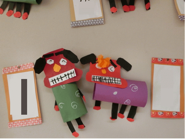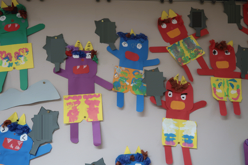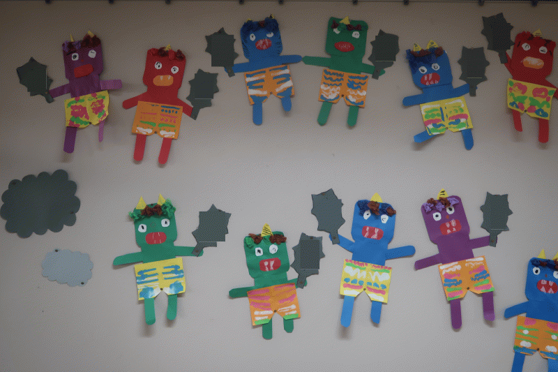鬼の顔や手、足は画用紙を角切りして作りました。パンツは、絵の具を使ってデカルコマニーで模様をつけ、「どんな顔にしようかな〜」とかっこいい眉毛を描いている子どももいて、楽しみながら制作する姿が見られました♪