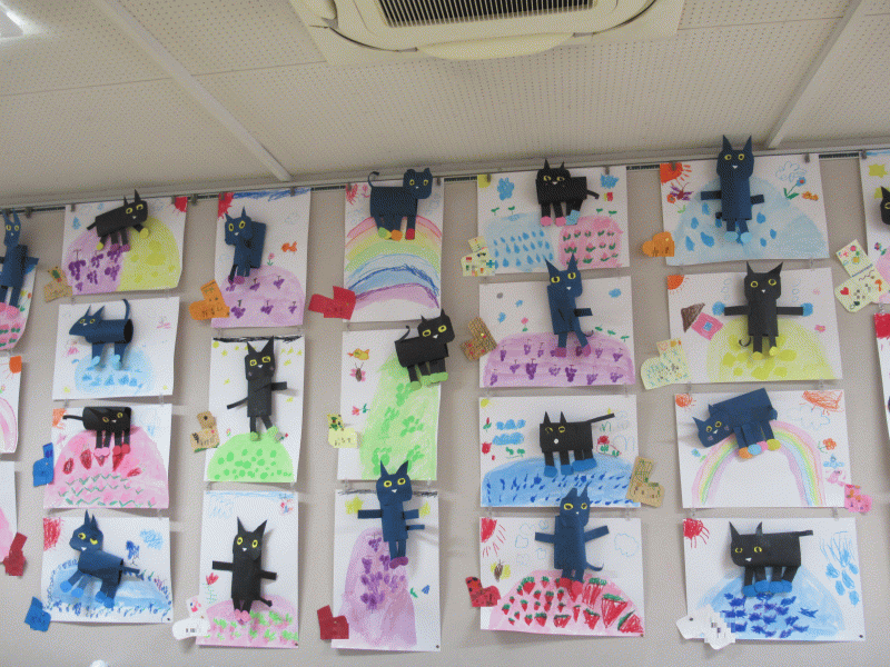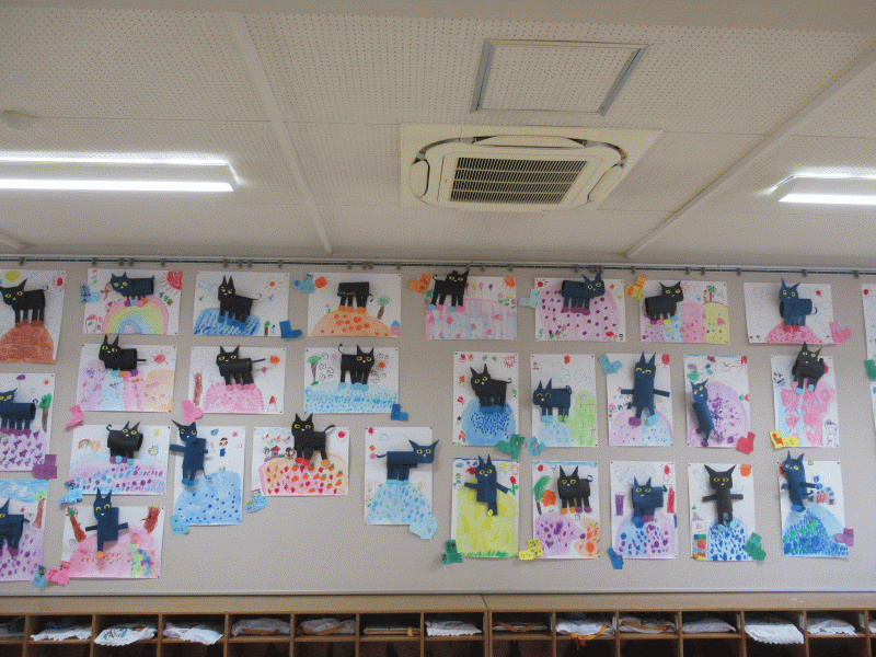 年中組の2月の壁面は、お話絵「ねこのピート」です!