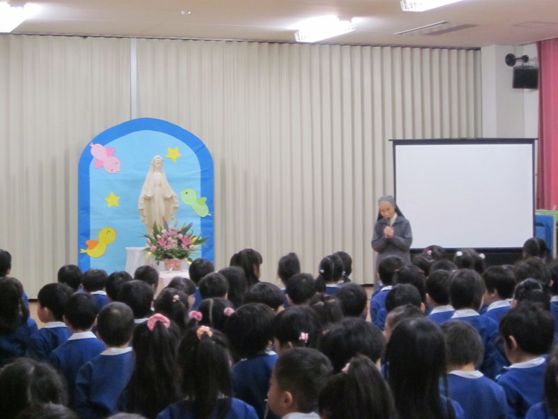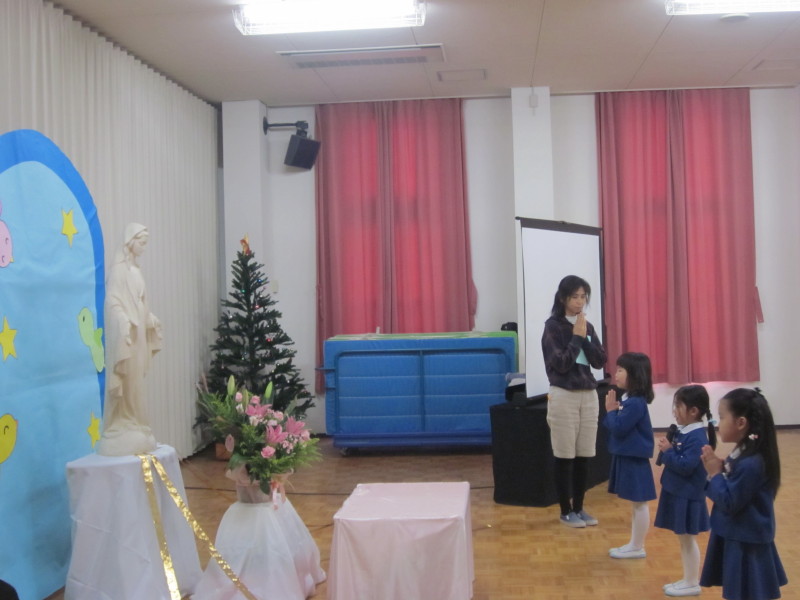 お友だちのことや、家族のこと、世界中の人達のことを思い、みんなで心を一つにして「マリア様に近づけるように、お導きください」とお祈りをお捧げしました。
