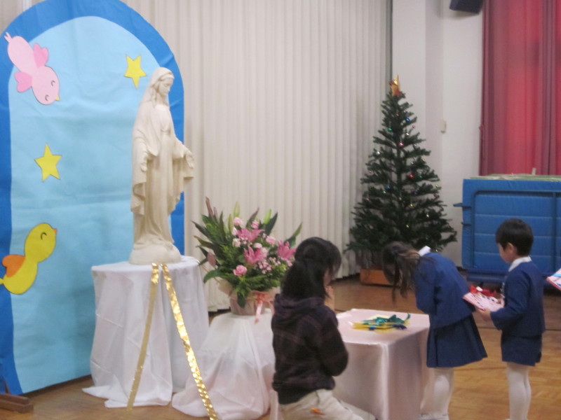 無原罪のマリア様のお祝いをした子どもたちは、お部屋に戻る前に、もう一度マリア様に手を合わせました。