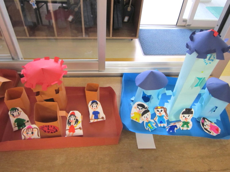 全 2083 件(全417ページ) 過去のページもご覧いただけます ⇒ 前へ 316 | 317 | 318 | 319 | 320 | 次へ 2011/11/18 ☆園開放 3日目☆年少組 園開放3日目は、製作「動物の帽子」作りです☆今日の子どもたちの様子は…♪ ねこさん・ぶたさん・くまさん・ねずみさん…色々なかわいい動物帽子を見て、「早く作りた〜い!」子どもたちはドキドキわくわく!「何の動物さんを作ろうかな♪」まずは作り方をしっかりと聞いて… ねこさん・ぶたさん・くまさん・ねずみさん…色々なかわいい動物帽子を見て、「早く作りた〜い!」子どもたちはドキドキわくわく!「何の動物さんを作ろうかな♪」まずは作り方をしっかりと聞いて… いよいよ、製作スタート!必要なものは揃ったかな?☆まずは、のりで耳や鼻をつけて…みんな一生懸命です。 いよいよ、製作スタート!必要なものは揃ったかな?☆まずは、のりで耳や鼻をつけて…みんな一生懸命です。 最後に、ハイマーカーで目を描きます♪にこにこのお顔だったり、ウインクしていたり、目を描くと個性いっぱい!素敵なかわいい動物帽子になりました☆ 最後に、ハイマーカーで目を描きます♪にこにこのお顔だったり、ウインクしていたり、目を描くと個性いっぱい!素敵なかわいい動物帽子になりました☆ 製作後は帽子を被って、うれしそうな子どもたち♪笑顔がとても輝いていました(^o^)お忙しい中、園開放にお越し頂きありがとうございました。 製作後は帽子を被って、うれしそうな子どもたち♪笑顔がとても輝いていました(^o^)お忙しい中、園開放にお越し頂きありがとうございました。 ☆園開放 3日目☆年少組 2011/11/18 園開放3日目は、製作「動物の帽子」作りです☆今日の子どもたちの様子は…♪ ねこさん・ぶたさん・くまさん・ねずみさん…色々なかわいい動物帽子を見て、「早く作りた〜い!」子どもたちはドキドキわくわく!「何の動物さんを作ろうかな♪」まずは作り方をしっかりと聞いて… ねこさん・ぶたさん・くまさん・ねずみさん…色々なかわいい動物帽子を見て、「早く作りた〜い!」子どもたちはドキドキわくわく!「何の動物さんを作ろうかな♪」まずは作り方をしっかりと聞いて… いよいよ、製作スタート!必要なものは揃ったかな?☆まずは、のりで耳や鼻をつけて…みんな一生懸命です。 いよいよ、製作スタート!必要なものは揃ったかな?☆まずは、のりで耳や鼻をつけて…みんな一生懸命です。 最後に、ハイマーカーで目を描きます♪にこにこのお顔だったり、ウインクしていたり、目を描くと個性いっぱい!素敵なかわいい動物帽子になりました☆ 最後に、ハイマーカーで目を描きます♪にこにこのお顔だったり、ウインクしていたり、目を描くと個性いっぱい!素敵なかわいい動物帽子になりました☆ 製作後は帽子を被って、うれしそうな子どもたち♪笑顔がとても輝いていました(^o^)お忙しい中、園開放にお越し頂きありがとうございました。 製作後は帽子を被って、うれしそうな子どもたち♪笑顔がとても輝いていました(^o^)お忙しい中、園開放にお越し頂きありがとうございました。 2011/11/17 ☆園開放 2日目☆年長組 今日は園開放2日目。「お城作り」をしました☆ 前日までに設計図を考えて、お城の形を作る所までしていたので今日はその続きです。まずは先生から、窓の作り方や屋根の作り方などを聞きました。 前日までに設計図を考えて、お城の形を作る所までしていたので今日はその続きです。まずは先生から、窓の作り方や屋根の作り方などを聞きました。 製作スタート!それぞれ、考えていたお城をイメージしながら作っていきます。 製作スタート!それぞれ、考えていたお城をイメージしながら作っていきます。 だんだんお城が建ってきました。子ども達の中には・・・「おやゆび姫のお城にするの♪」「落ち葉のお城にする!」と楽しそうな声が聞こえていました。 だんだんお城が建ってきました。子ども達の中には・・・「おやゆび姫のお城にするの♪」「落ち葉のお城にする!」と楽しそうな声が聞こえていました。 今日はここまで…☆もうすぐ完成です!楽しみですね(^▽^) 今日はここまで…☆もうすぐ完成です!楽しみですね(^▽^) ☆園開放 2日目☆年長組 2011/11/17 今日は園開放2日目。「お城作り」をしました☆ 前日までに設計図を考えて、お城の形を作る所までしていたので今日はその続きです。まずは先生から、窓の作り方や屋根の作り方などを聞きました。 前日までに設計図を考えて、お城の形を作る所までしていたので今日はその続きです。まずは先生から、窓の作り方や屋根の作り方などを聞きました。 製作スタート!それぞれ、考えていたお城をイメージしながら作っていきます。 製作スタート!それぞれ、考えていたお城をイメージしながら作っていきます。 だんだんお城が建ってきました。子ども達の中には・・・「おやゆび姫のお城にするの♪」「落ち葉のお城にする!」と楽しそうな声が聞こえていました。 だんだんお城が建っ