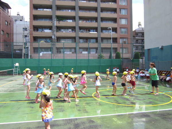 年少組と年中組が、ひとあし先に着替えのために部屋に戻り、年長組だけになると、遊び方が変わって、とても大胆になっていました。