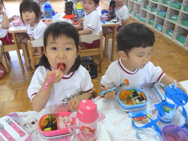 おいしそうな、真っ赤なトマトができたので、年少組みんなで食べることにしました。