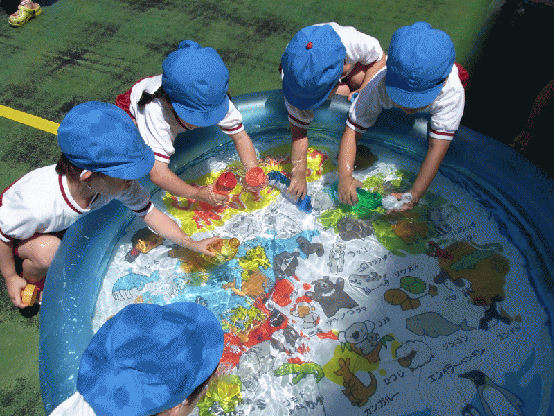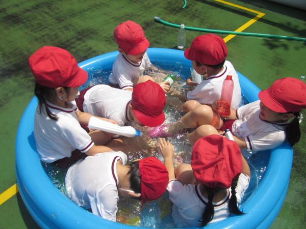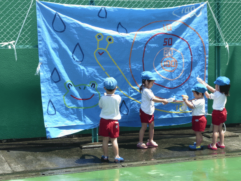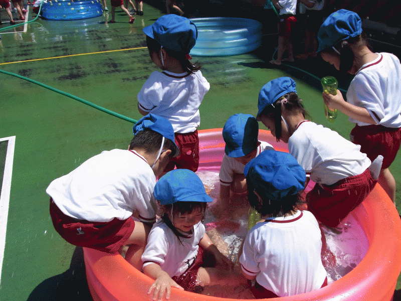 プールには入れなかったけれど、ビニールプールに入ったり、水鉄砲やホースのシャワーなどで、水遊びを満喫した子どもたちでした。