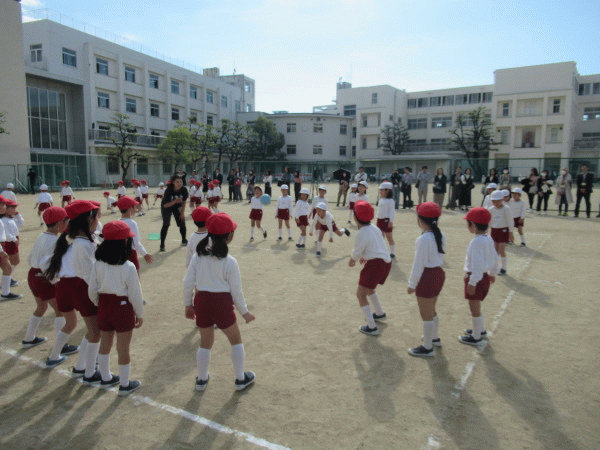 グラウンドに年長組が集まると、まずは準備体操!