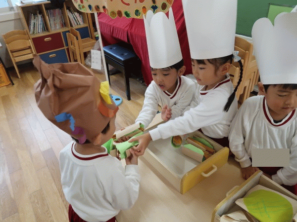 メロンパン、ホットドックなど様々なパンが売っているパン屋さんにウキウキしながら、おともだちと一緒に買って、食べて楽しむ様子が見られました(*^^*)