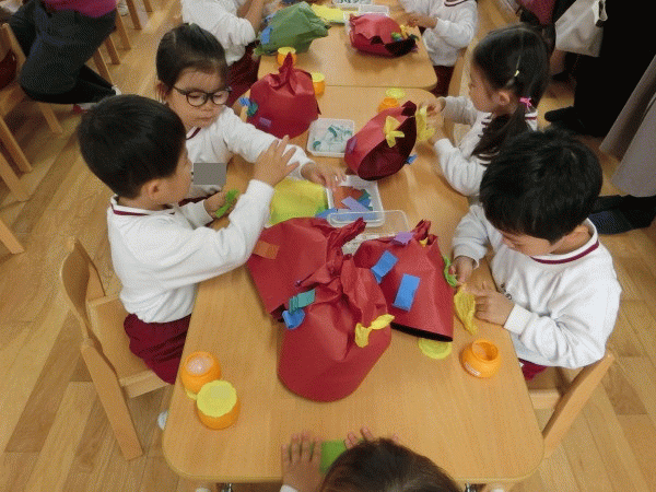 「みんなもどんぐりさんに変身して、パン屋さんをしよう!」とカタカタ折りや花紙で飾り付けをし、ステキなどんぐりの帽子を作りました☆