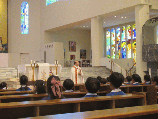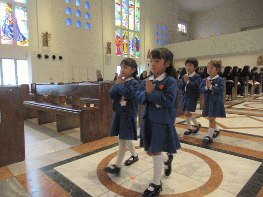 子ども達が胸の前に手を合わせて入堂し、神様にご挨拶をします。年長組らしく堂々とした姿に成長を感じました。