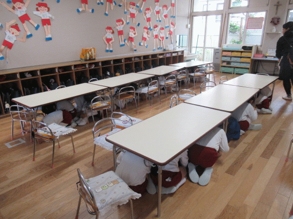 まずは、各クラスで避難のお約束を確認し、取り組みました。