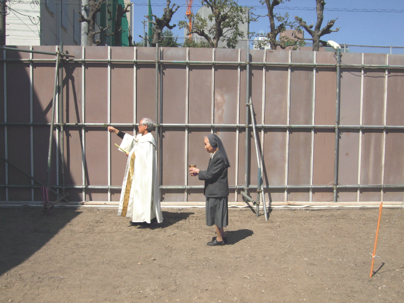 神父様が、敷地を一巡し、聖水をそそぎ土地を清め、祝福をしてくださいました。