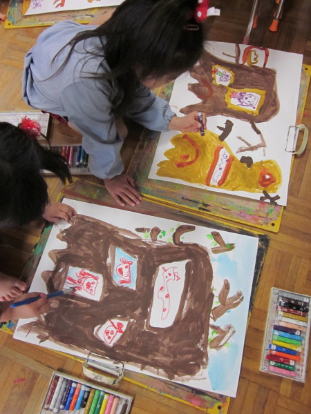 クレパスで、木に住んでいる色んな動物を描いて行きます♪