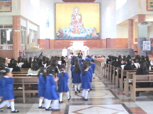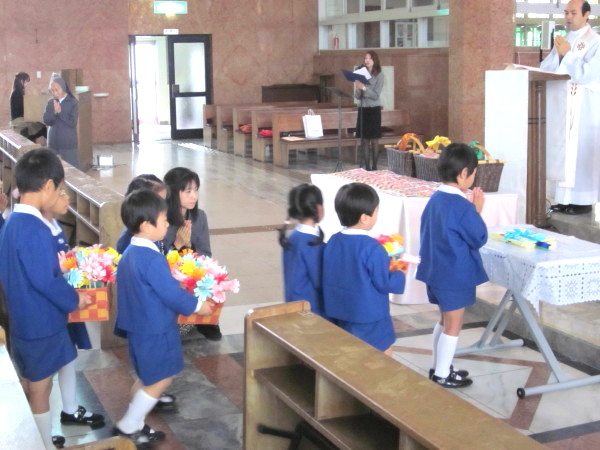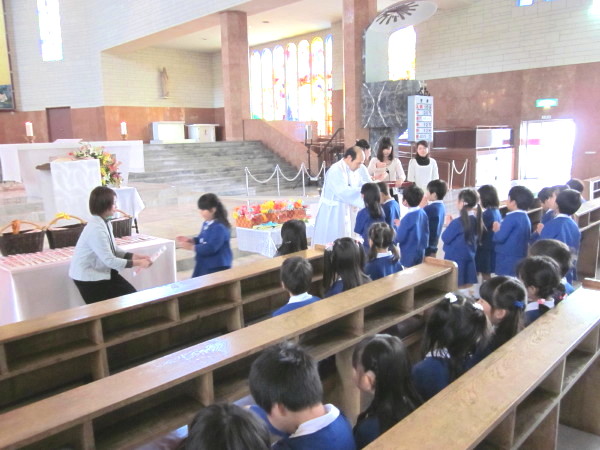 ひとりずつ、神父様におめだいを掛けてもらい、先生から記念の飴を頂きました。