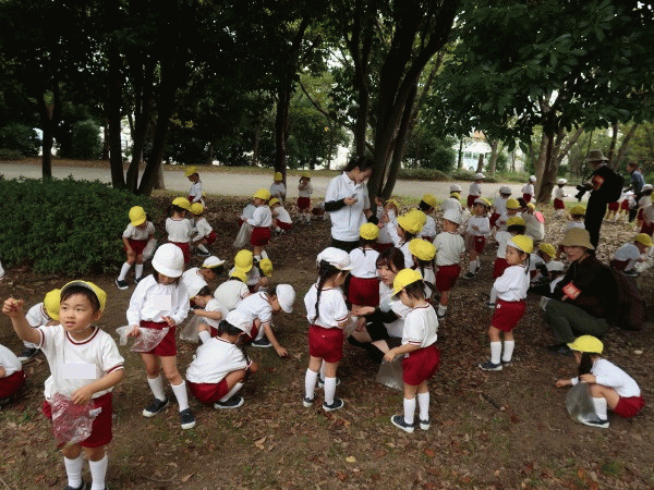 幼稚園では、どんぐりや木の実を使ってごっこ遊びをしています^^♪ご家庭でもいっぱい見つけたら、是非持たせてあげてください♪砂場で「もりのおみせやさん」が繰り広げられています!