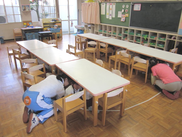 《ナマズの音(地震を知らせる音です)》に少し驚いていた子ども達ですが、落ち着いて机の下に隠れることが出来ました☆