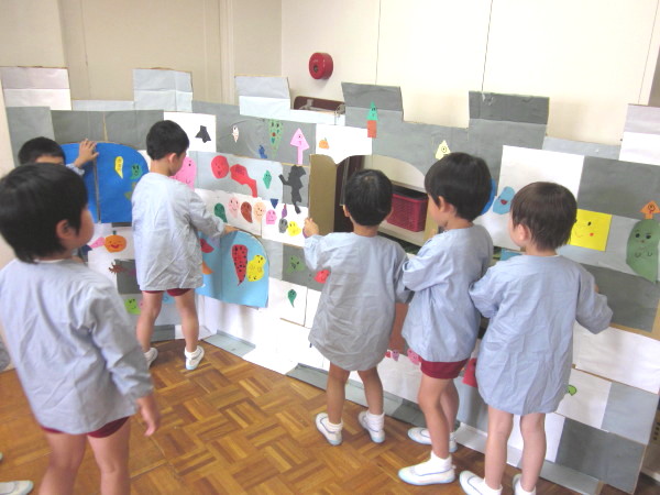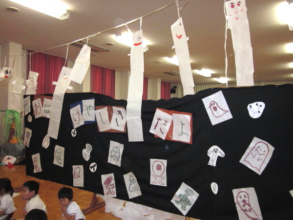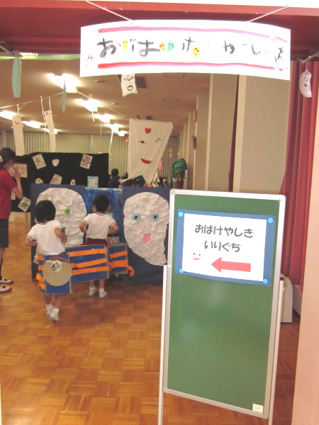 いよいよ本日、一日限りの《☆おばけやしき☆》が2階遊戯室にて公開されることになりました!!「おばけやしき」をするにあたり、クラスで何度も協議・打ち合わせを重ね、それぞれの持つおばけプランを出し合いながら、3クラスで役割分担を決めて取り組んできました。