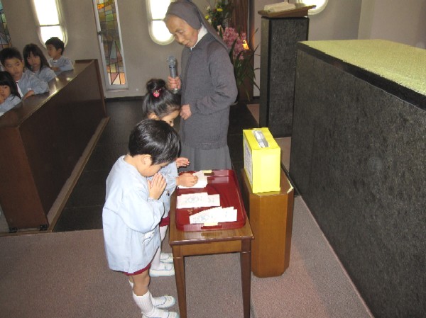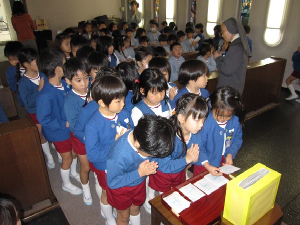 引き続き、幼稚園の2階のマリア様の前に献金箱を