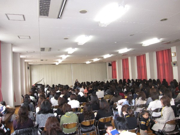 遊戯室では、保護者の方にむけて園長先生の講話が行われました。