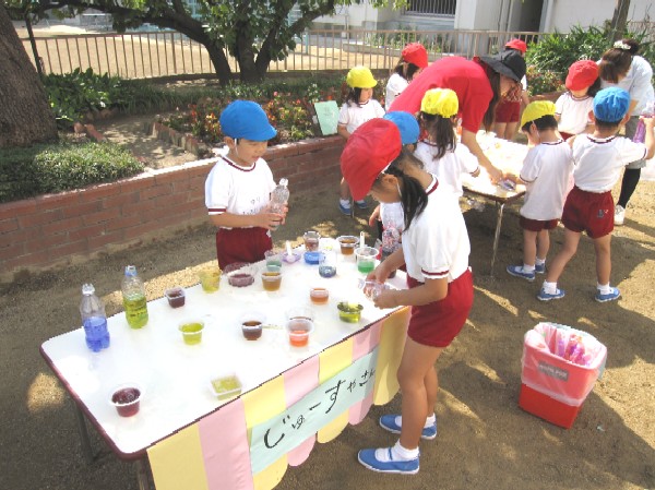 お隣のジュース屋さんでは、綺麗な色水を作っては
