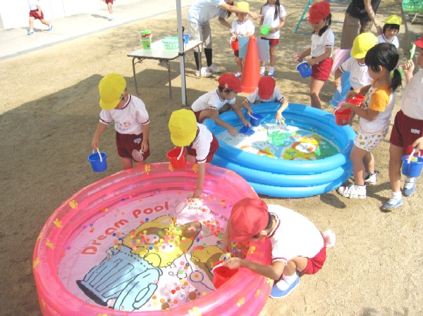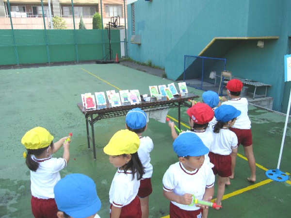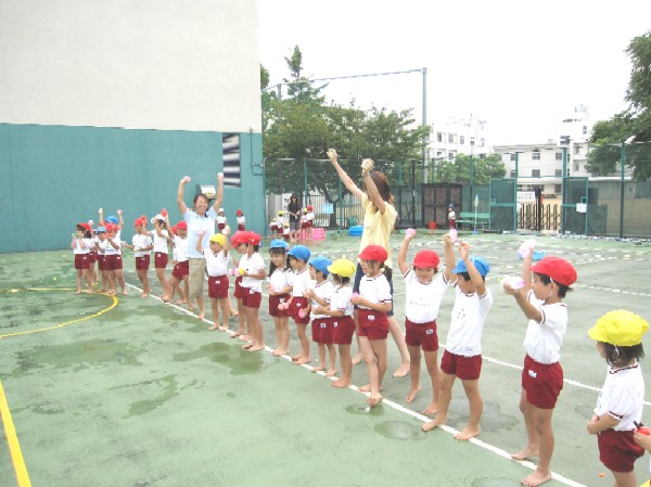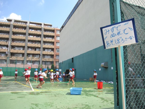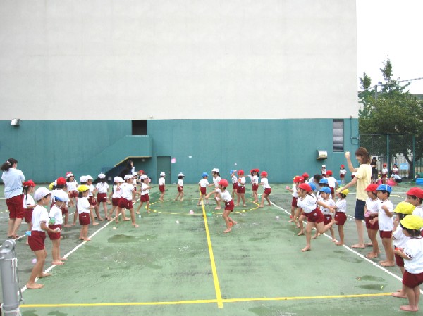 最後は、先生もみんな、びしょぬれになって水かけごっこ遊び。
