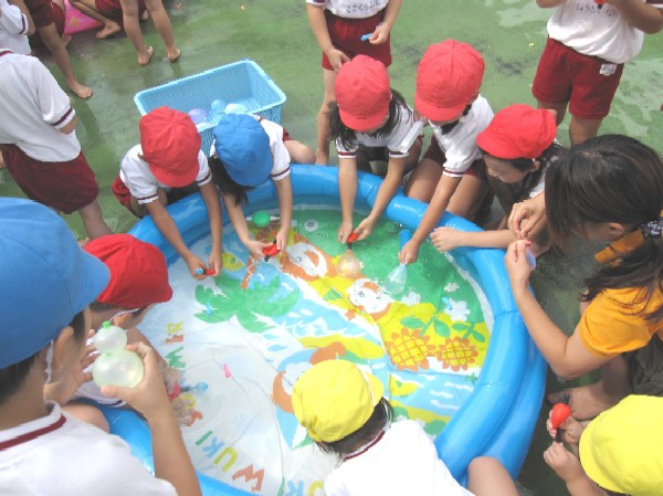 最終日は、前日から先生達が作り溜めた水風船がスタンバイ・・・。