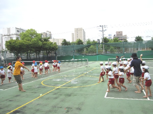 お隣のテニスコートを借りて、色んな水遊びができます。