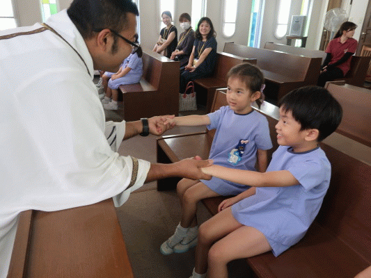 お父さんやお母さんは、もともとは他人。結婚して子どもが生まれたことで『お父さん』『お母さん』と呼ばれるようになり、家族は繋がります。イエス様は、人と人を繋ぐ存在であった為、幼稚園の子ども達にも「人と人を繋ぐ存在になってほしい。」と神父様がイエス様の役割をし、子ども達同士の手を繋いで見本を見せながら、お話をしてくださいました。