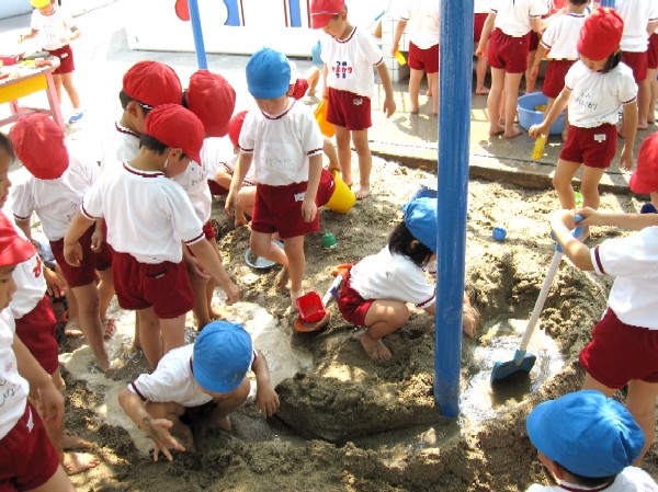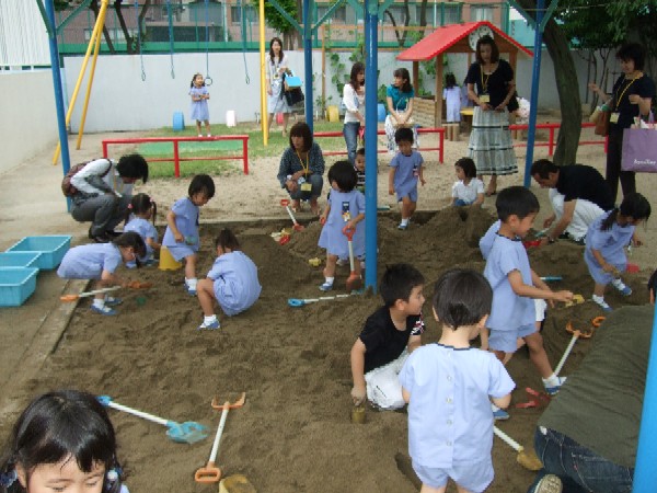 事前に担任の先生から、砂場遊びについてのお話を聞いています。