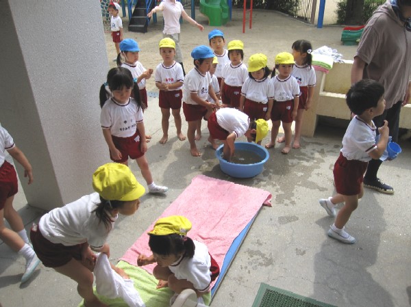 年中・年少組は先生に足を洗うのを手伝ってもらいます。