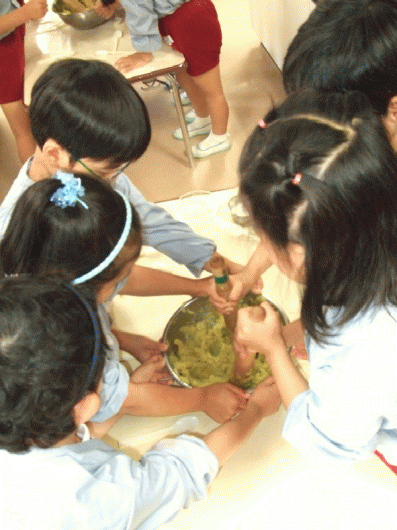 クラスごとにグループに分かれ、茹でてあるお芋をみんなで順番につぶし、そこに牛乳・砂糖・バターを混ぜ、最後にアルミカップに入れました!