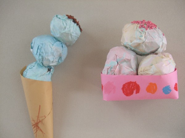 コーンにするかカップにするかを選び、マーブリングで味付けをして、トッピングにはトイレットペーパーこねて作ったフレークをのせました☆★☆