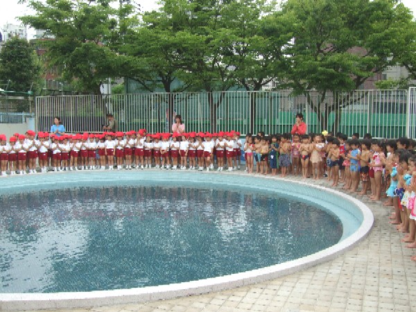 雨も上がり薄日が射す中、子ども達みんなでプールサイドに集まって、楽しくプール遊びが出来るようにお祈りをしました。