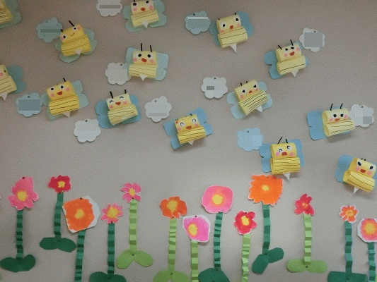 可愛いハチさんがたくさん飛んでいる楽しい壁面になりました!